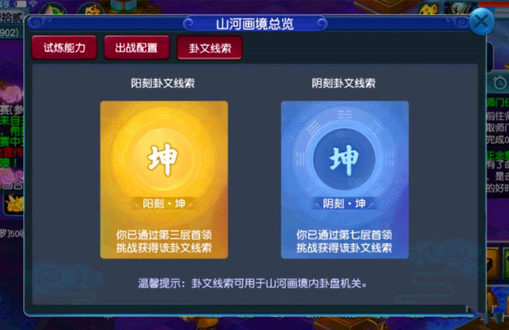 对于上面的这个界面,刷山河画境的玩家应该都不陌生,这就是山河画境玩法中的挂文线索界面,各位玩家在第3关和第7关完成了指定的挑战以后就能够解锁。只是上面这位玩家现在解锁出来的挂文线索条件居然全部都是坤,所以有一部分玩家表示梦幻西游中有小黑子。